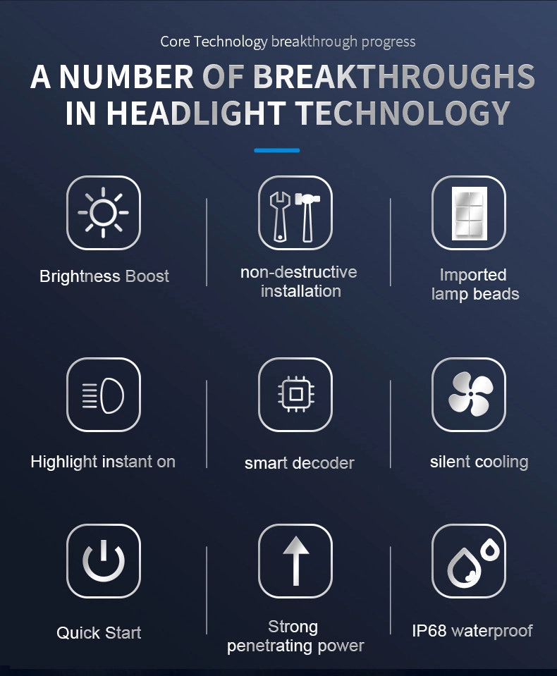 Equipped with CSP3570 customized lamp beads. This technology enables the headlights to emit a highly focused and concentrated beam of light, significantly improving visibility on the road. These lamp beads leverage state-of-the-art semiconductor technology to generate an impressive 6000lm/bulb of high-intensity light output. With this innovation, you can experience enhanced brightness and an extended range, ensuring safer and more confident driving in various conditions.